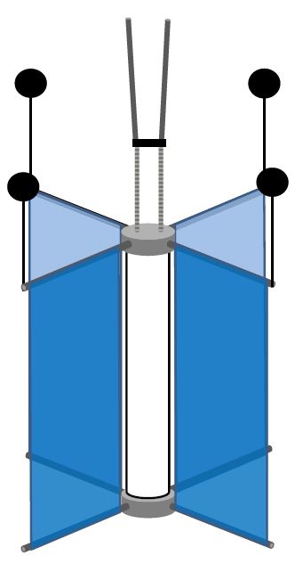 The buoy uses a semi-rigid structure with four square, drag-inducing “vanes” extending from a central cylindrical hull. The center of drag is positioned at 1 meter of water depth. Positive buoyancy is obtained via 4 small floats attached to the vane arms. This design minimizes the influence of wind and the forces resulting from wave action. The DBi Iridium-CODE is the only buoy of its type that offers a single mast antenna system – further reducing wind-induced drag.
